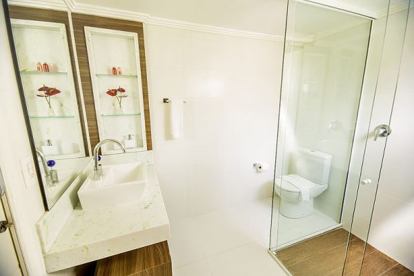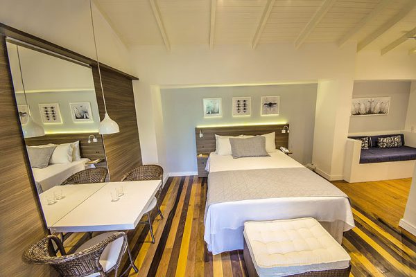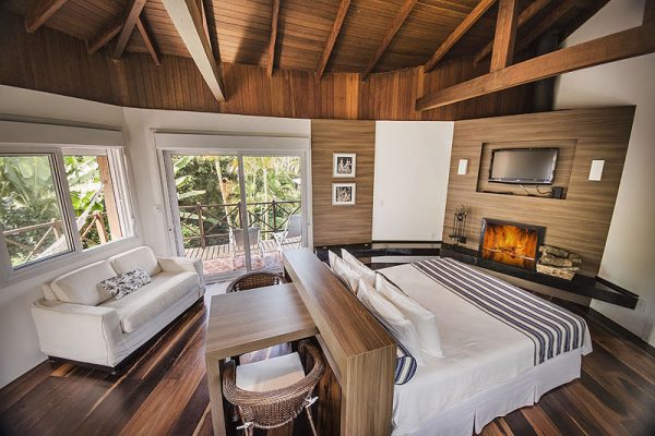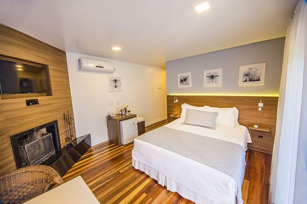 Suíte para casais, possui uma moderna decoração com móveis planejados com requinte e conforto, iluminação diferenciada e aconchegante, além de lareira para aquecer os dias frios e sacada para aproveitar os dias quentes.
