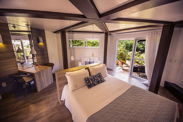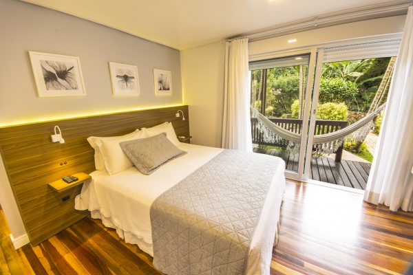 Suíte para casais, com vista para o mar, decoração moderna com móveis planejados, requinte, conforto, iluminação diferenciada e aconchegante, e sacada para aproveitar os dias quentes.